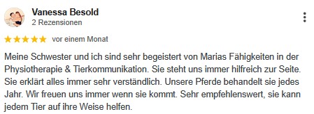 Die Tierkommunikation hat mir persönlich sehr geholfen meine Stute besser zu verstehen und ihr bei ihren Problemen zu helfen. Eine anschließende Bioresonanz kam zu den selben Schlüssen wie Maria.
