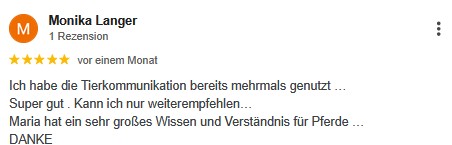 Die Tierkommunikation hat mir persönlich sehr geholfen meine Stute besser zu verstehen und ihr bei ihren Problemen zu helfen. Eine anschließende Bioresonanz kam zu den selben Schlüssen wie Maria.